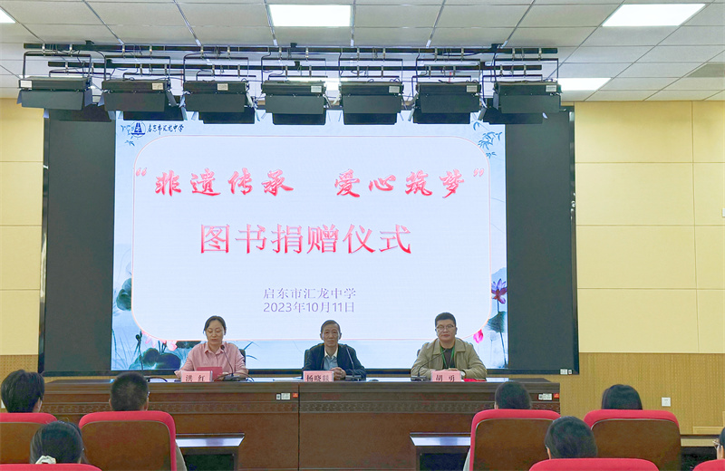 一支笔可以书写知识,一张纸可以记录世界。十月的微风,吹开了轻合的书页,掀起了阅读的热潮。2023年10月11日,在这个秋意浓浓,充满希望的美好季节,启东市汇龙中学举办“非遗传承 爱心筑梦”图书捐赠仪式,共同感受爱的阳光,共同见证爱的奉献。