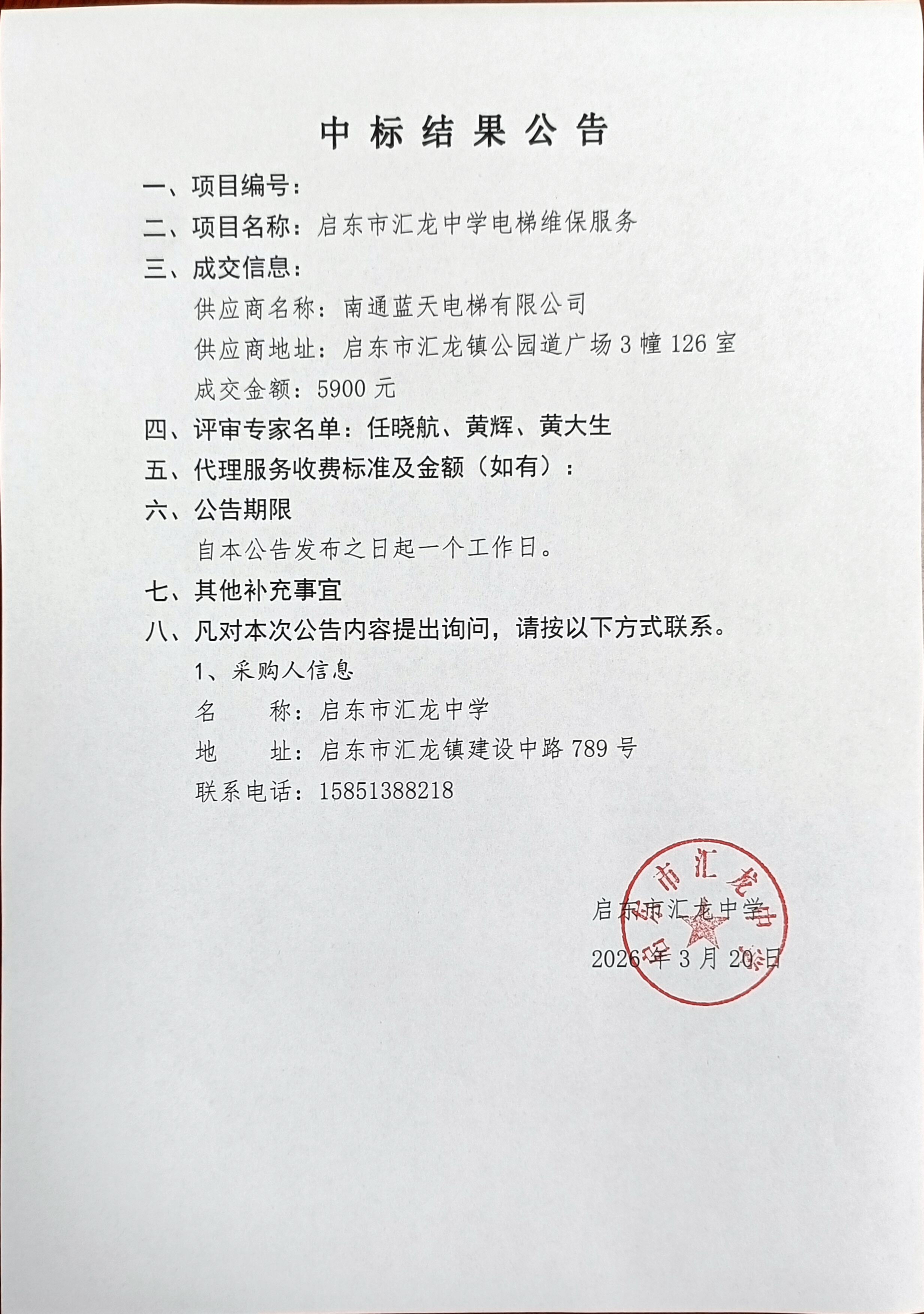 启东市汇龙中学电梯维保服务项目中标结果公告